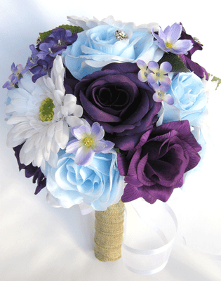 There are an abudance of flowers to choose from for a blue and purple wedding theme, and they combine together wonderfully with shades of white, ivory and green. White, cream, silver, and green combine well with both purple and blue, while yellow is a lovely accent these substantial flowers last about two weeks after cutting and easily stand up to the tousling every wedding bouquet receives. When you come up with a design for invitation cards, remember what flowers do you associate with purple? Perhaps it's lavender, violet, lilac or iris that will become the trump of your. These playful purple roses, purple alstroemeria and purple daisies are a great colorful floral stem.